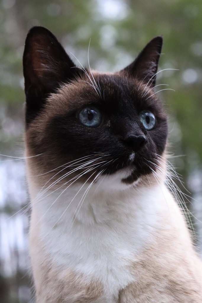 Queenie is a tiny 21 year old cat, rescued with her mom as the sole survivor of her litter. Her favorite activities include lap sitting, prolonged eye contact, being angry, belly rubs, and staring at hidden demons just behind your head. Here she is at age 17.